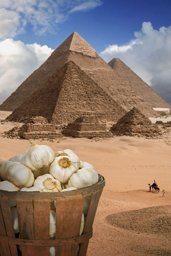 ギリシャの歴史家・ヘロドトスは、紀元前450年頃にエジプトを旅行し、ピラミッドの上に刻銘された象形文字に「ピラミッドの建設に従事した労働者が大量のにんにく、タマネギ、ラディッシュを食し、これらを購入するために高額の銀が支払われた」と記されていたと、著書『エジプト記』に残しています。その象形文字には、労働者たちが体力維持に使ったにんにくやタマネギの消費総量が記されており、当時の銀単位で16,000タラントもの量を一日で消費していたことがわかりました。にんにくやタマネギは、ピラミッドの建設に関わった労働者たちの貴重な活力源として利用されていたのです。なんらかの理由でにんにくの配布が一時的に止まると、労働者たちはストライキを起こしたとも伝えられており、その利用が日常不可欠であったことがうかがわれます。私は、にんにくの役割は労働者の体力維持のみでなく、石運び、石切り、石積みなど重くて硬い石の作業に伴う手足の傷など外傷の治療や、腹痛の治療などになくてはならない貴重なものであったと考えています。にんにくを薄く切って貼付けておけば、「傷が膿んで働けなくなる」ことがなかった、ということは想像に難くないところです。